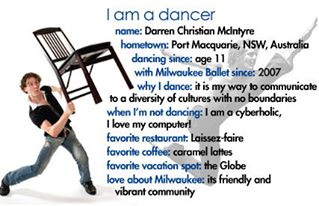 Mr. McIntyre has toured extensively throughout the United States, Australia, Asia, Canada, Europe & South America, performing a wide range of classical, neo-classical, modern, contemporary and musical theatre works as a freelance artist & with such companies as Louisville Ballet (KY-USA), City Ballet of San Diego (CA-USA), Milwaukee Ballet (WI-USA), Ajkun Ballet Theatre (NYC-USA), The Landestheater Detmold in Germany, The National Ballet of Ireland & The Australian Ballet Dancers Company.