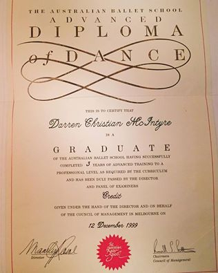Originally from Port Macquarie, New South Wales Australia, Darren McIntyre is a graduate of The Australian Ballet School, receiving his Advanced Diploma of Dance in 1999.
