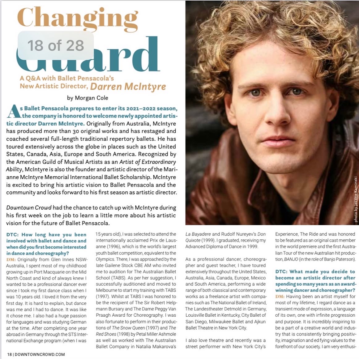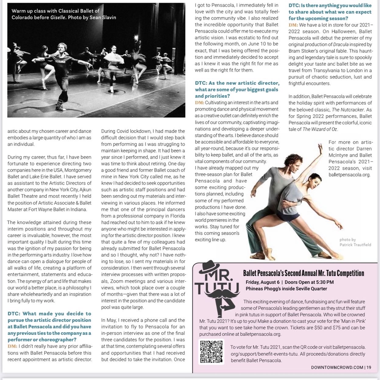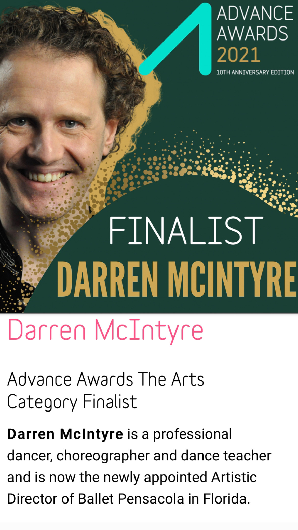 In 2009 Mr. McIntyre took up the position of Artistic Director, Casting Agent and Talent Scout at DManagement International Dance Agency, a presenting agency established to promote some of the world’s finest artists to the performing arts industry. Darren was then appointed Artistic Director, Ballet Master & resident Choreographer of Montgomery Ballet, Alabama USA in January 2012 and brought to the company several innovative creations as well as maintaining the traditional classic repertory ballets throughout his three-season tenure. In 2015 he served as Interim Artistic Director, Ballet Master & resident Choreographer for Lake Erie Ballet, Pennsylvania USA. In 2017 Darren served as Artistic Associate, Ballet Master and Guest Artist/Choreographer with the Fort Wayne Ballet in Indiana USA. In 2021 Mr. McIntyre accepted a three-year appointment as Artistic Director of Ballet Pensacola professional Company in Florida, USA where he also collaborated with Pensacola Opera, Pensacola Symphony, Foo Foo Fest, Vacation Artfully and Pensacola Little Theatre.
