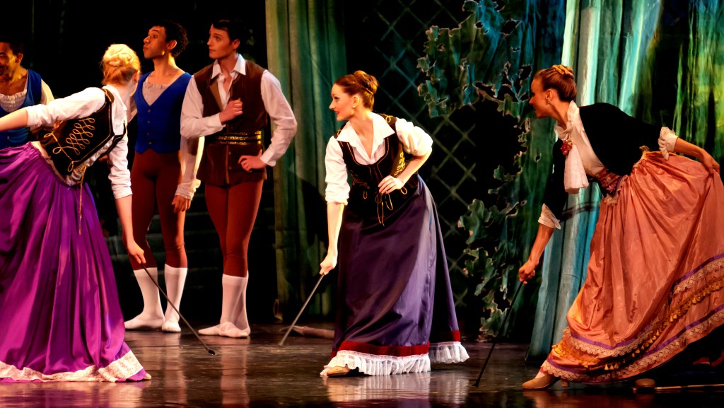 It is Princess Aurora’s sixteenth birthday. Celebrations are already underway: the atmosphere is festive, made complete with a waltz danced by the villagers with garlands. There are women knitting close by: Catallabutte orders them taken away to prison lest their needles precipitate calamity. The king angrily agrees, as he has decreed. After entreaties by the four princes, the women are reprieved amidst rejoicing. Aurora receives her four royal suitors and their gifts of exquisite roses. Soon after, Aurora is presented with a spindle as a gift from a disguised Carabosse—an object which she has never seen before. Carelessly, she dances with it despite her mother and father’s warnings before accidentally pricking herself. She faints. To the horror of all, Carabosse immediately reveals her true wicked self triumphantly, vanishing before the princes can vanquish her. The princes and their attendants depart for their native countries in fear. At that very moment, the Lilac Fairy appears as she had promised. She reminds the remaining guests and the King and Queen of her gift—Aurora will not die but merely sleep. She then casts a spell of slumber upon the entire kingdom so that they will only awake when Aurora does.